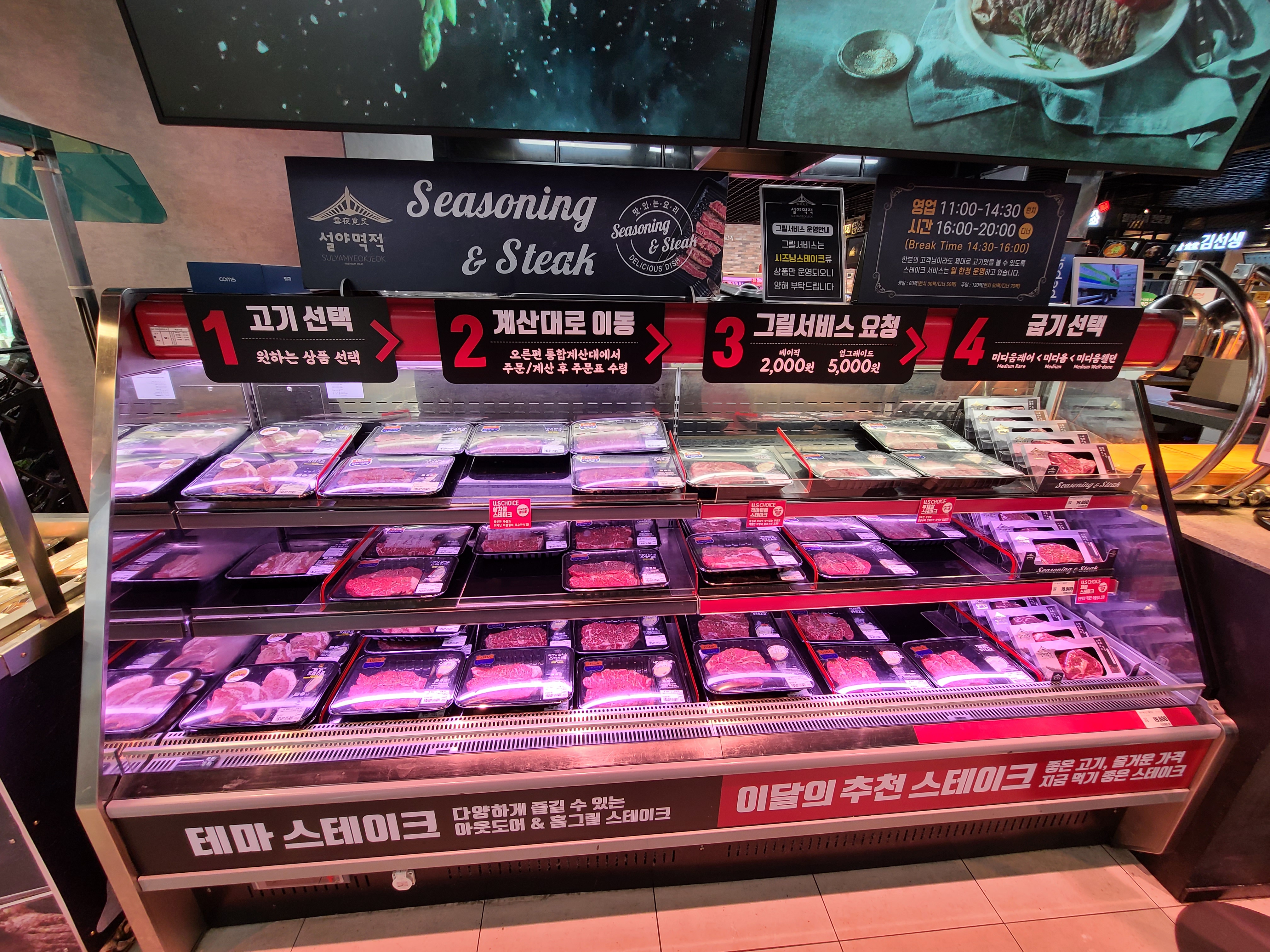 이브닝 라운지에서 충분히 즐기고 롯데마트에 가서 스테이크를 테이크아웃했습니다. 간판(?)이 잘 안 보여 찾기 힘들었으나 뛰어난 후각으로 금세 찾아 주문했습니다. 원하는 고기를 골라 계산대로 가져다 드리면 사이드 메뉴 정하고 지불만 하면 됩니다. 한 10분 정도 소요됐고 그동안 저희는 롯데마트를 둘러보다가 계산대 옆에 있던 닭강정도 함께 구매했습니다. 스테이크 집 바로 옆에 닭강정 있으니 어렵지 않게 찾을 수 있어요!