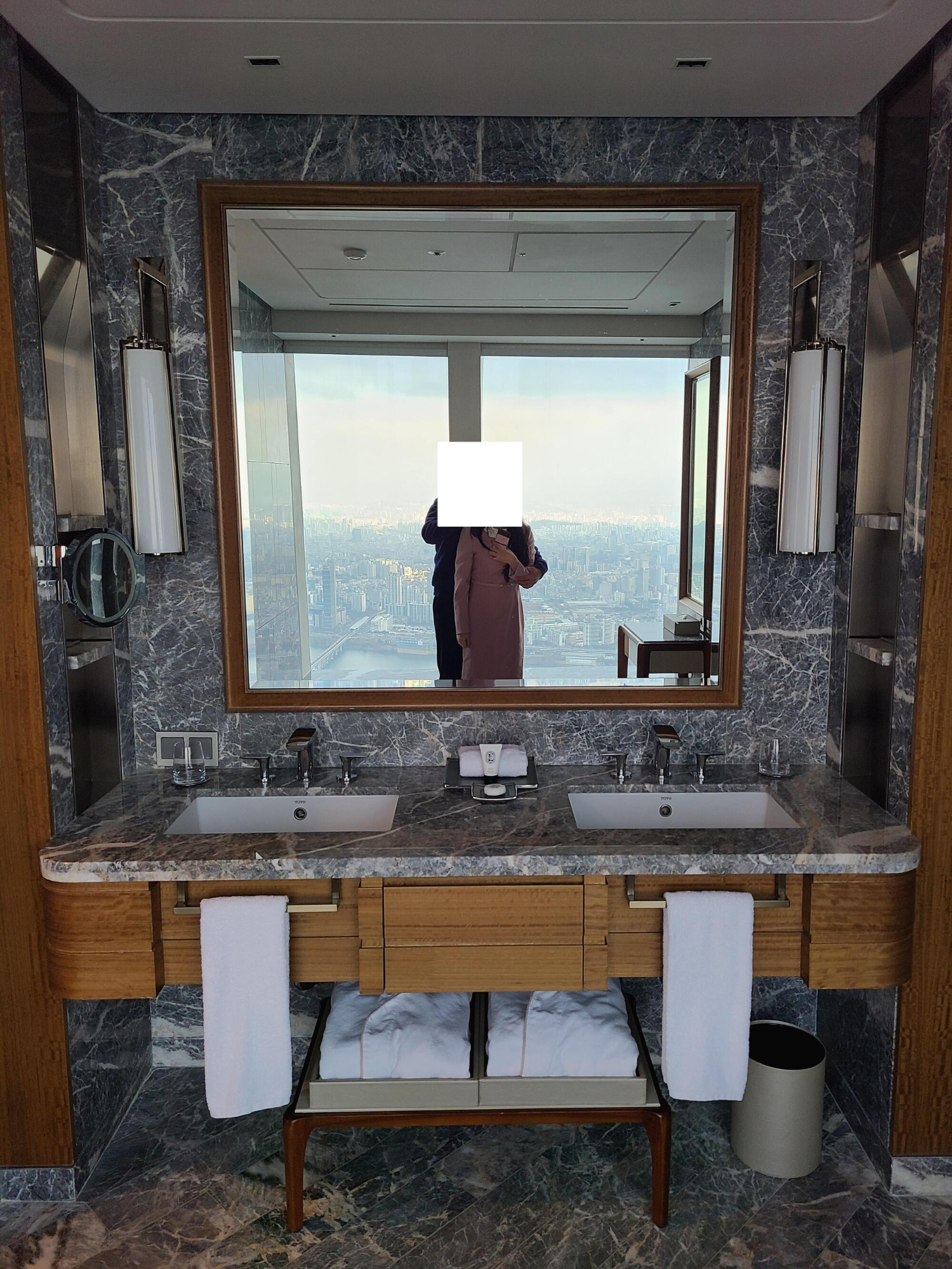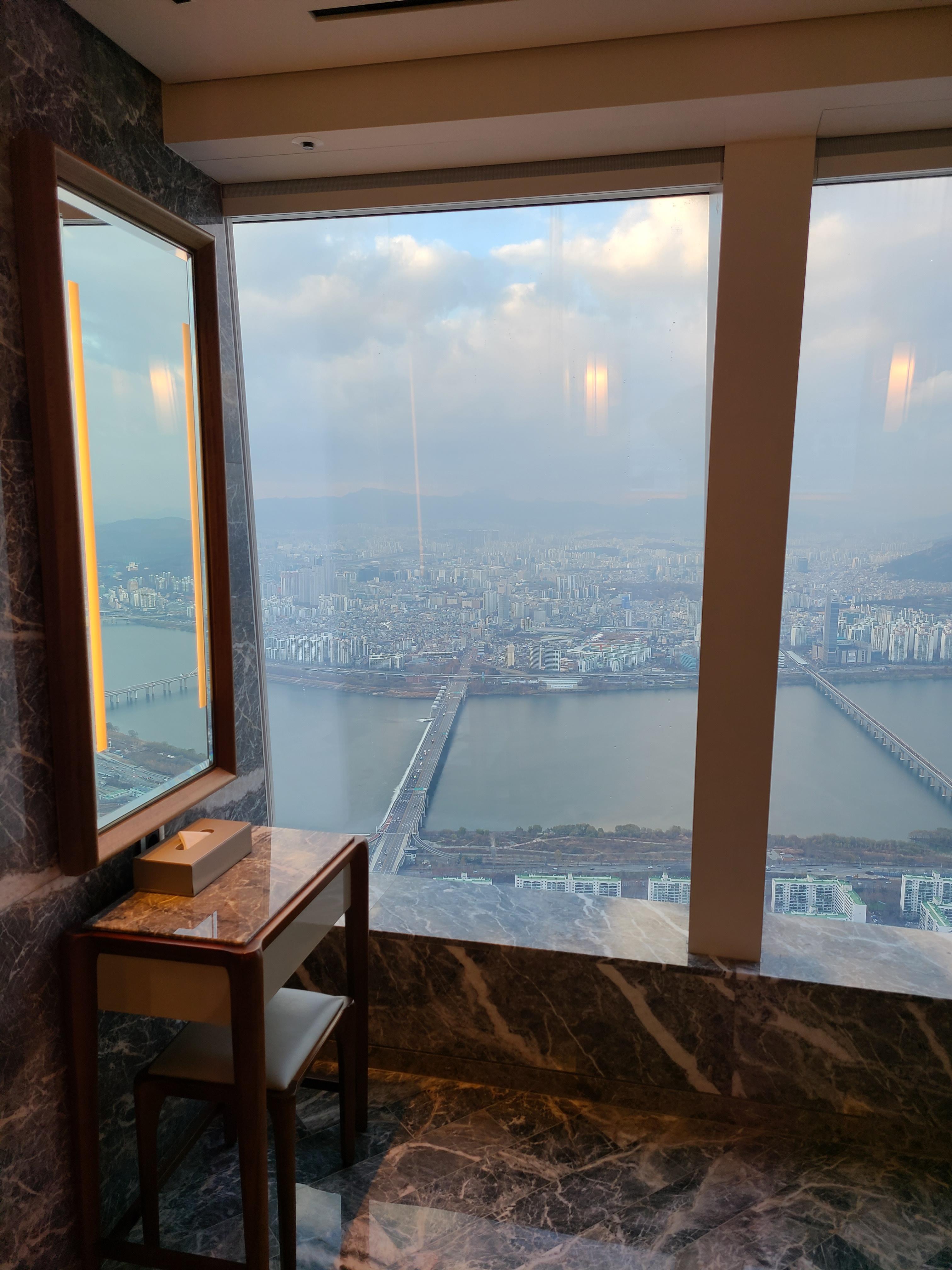 먼저 세면대에서부터 압도되는 뷰를 보여줘요. 거울로 비치는 뒷배경이 서울입니다. 아침에 일어나서 양치하면서 매일 보는 뷰가 이런 뷰라면 진짜 왕이 된 기분일 거 같았어요. 거울도 큼직하여 뷰가 더 눈에 쏙 들어옵니다.