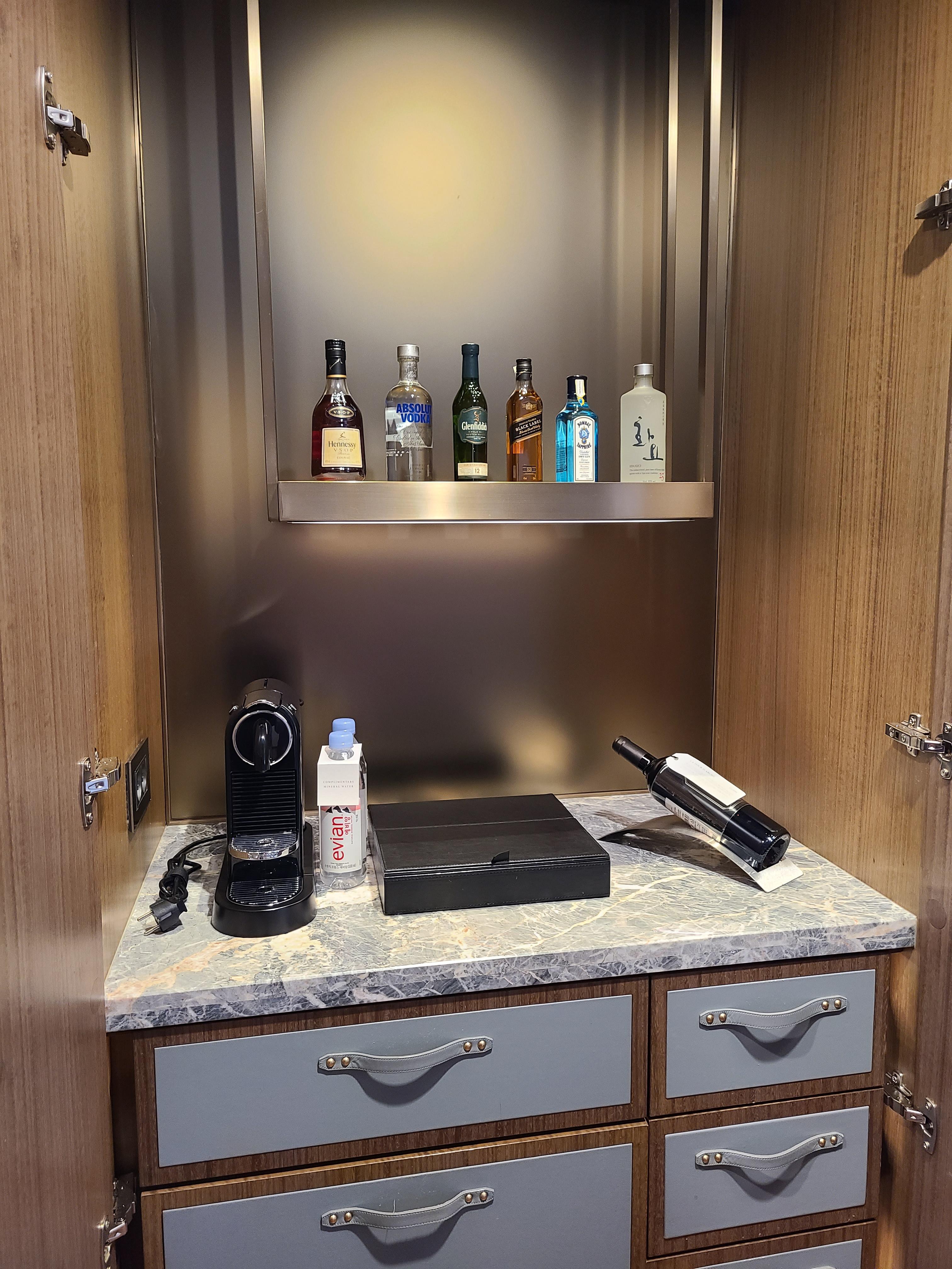 각종 술과 음료가 비치되어있었고 그중 티, 커피 캡슐, 에비앙은 먹어도 되는 거예요.