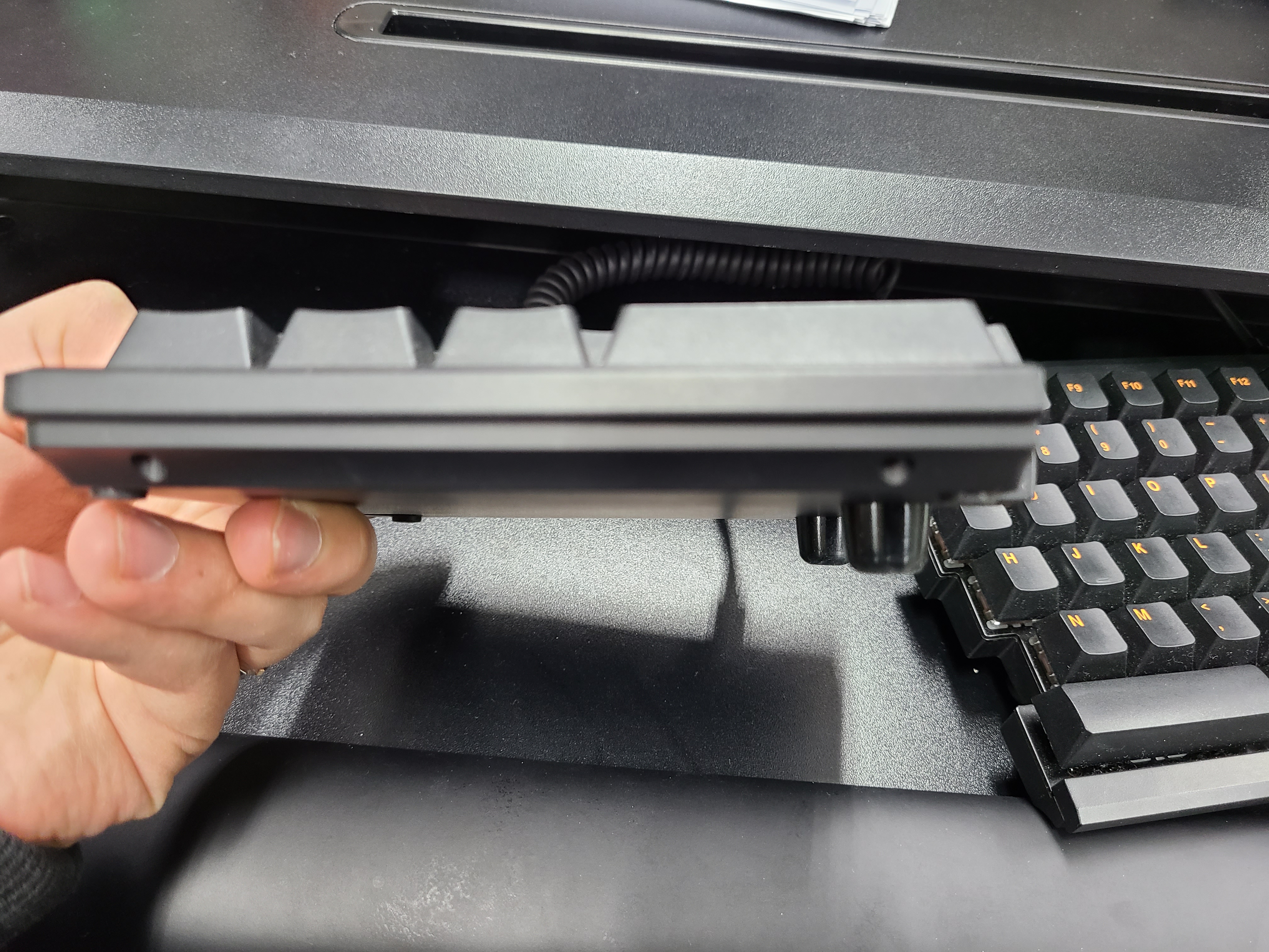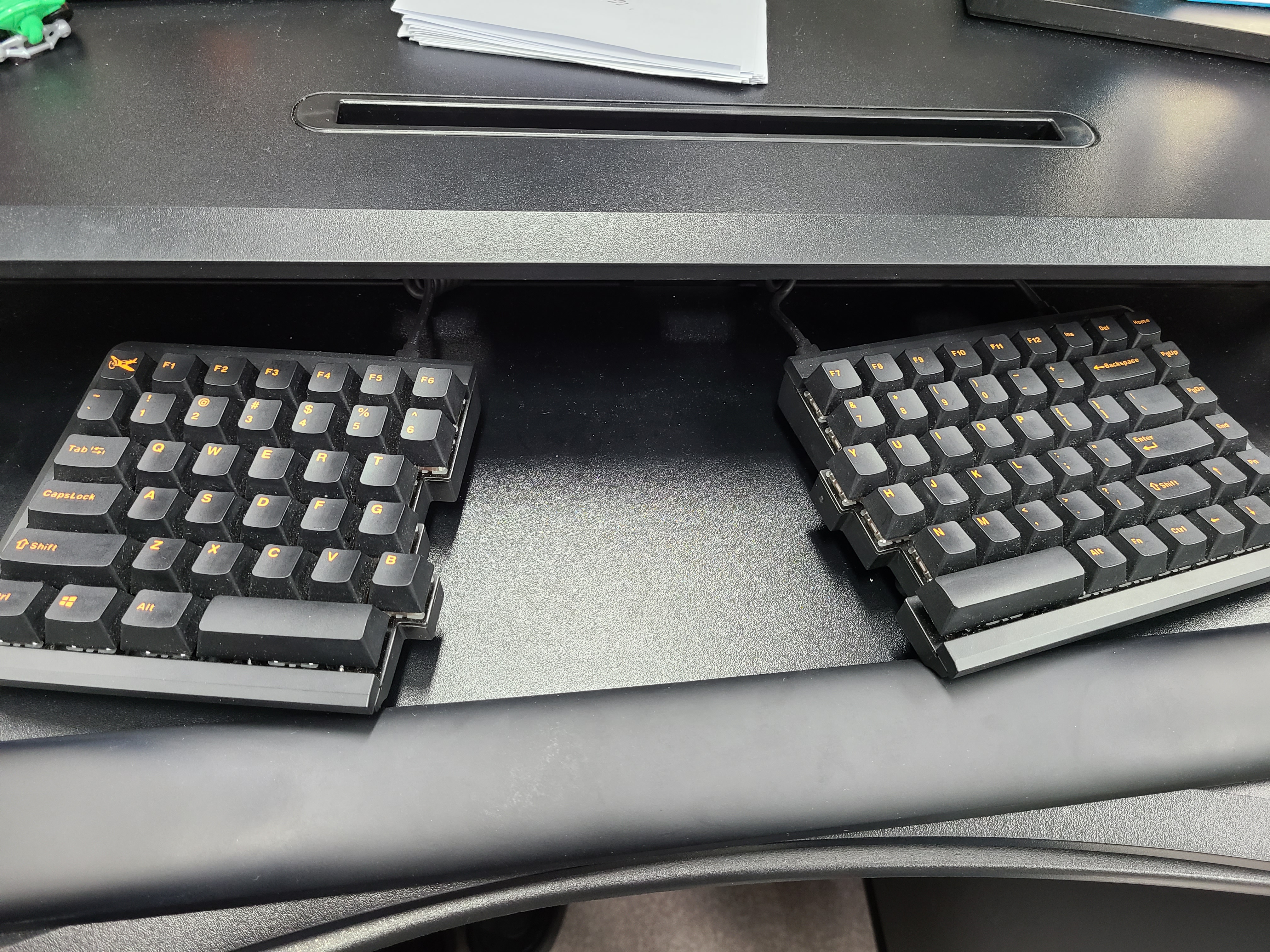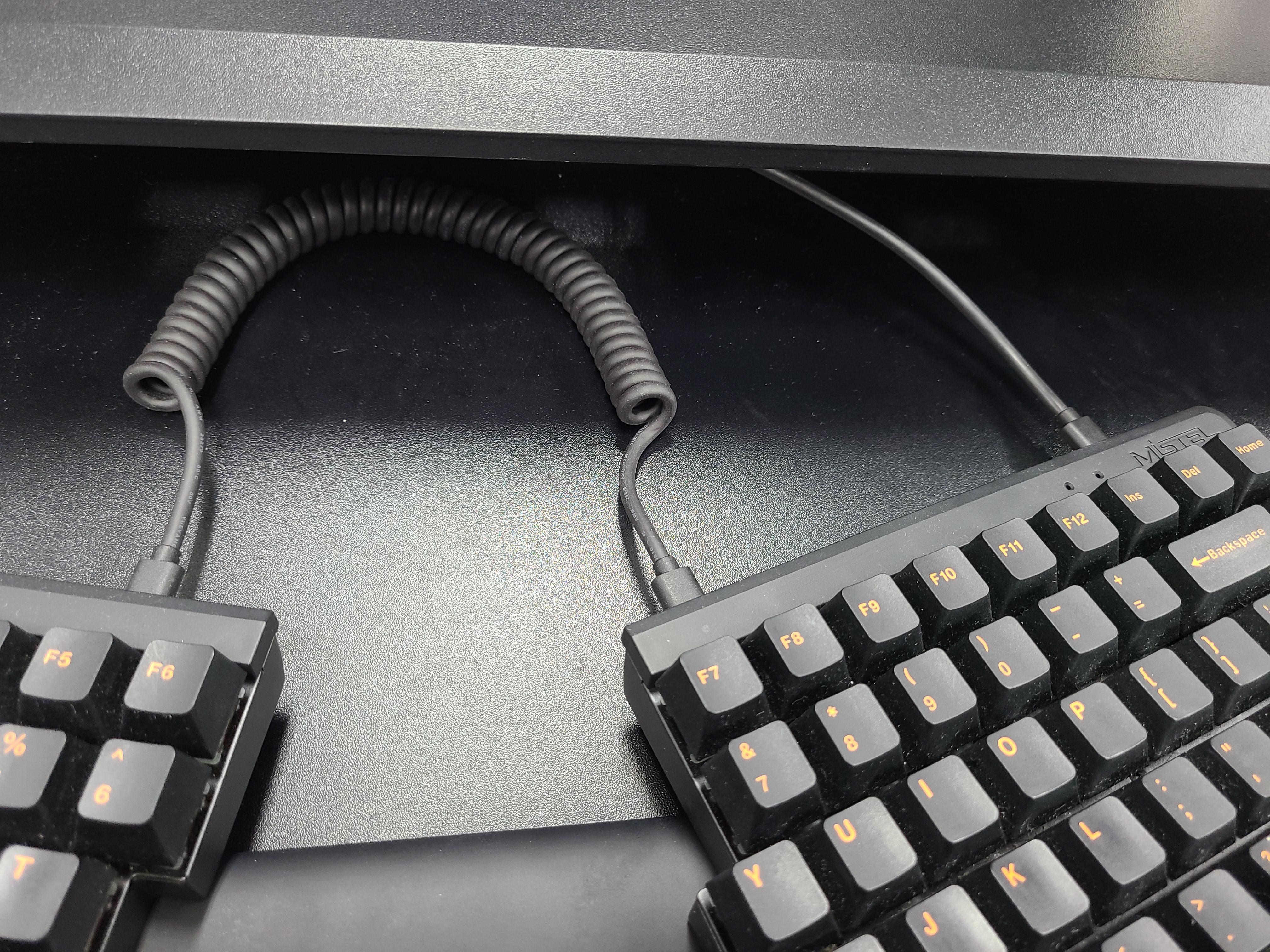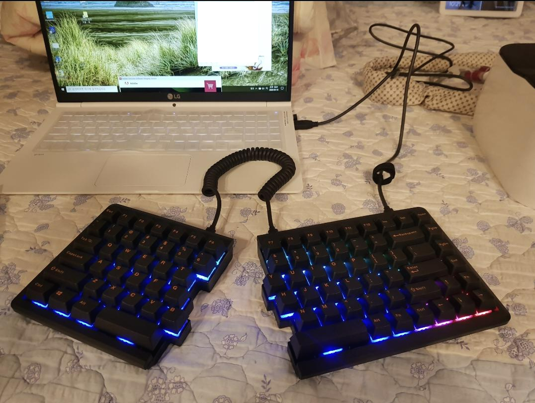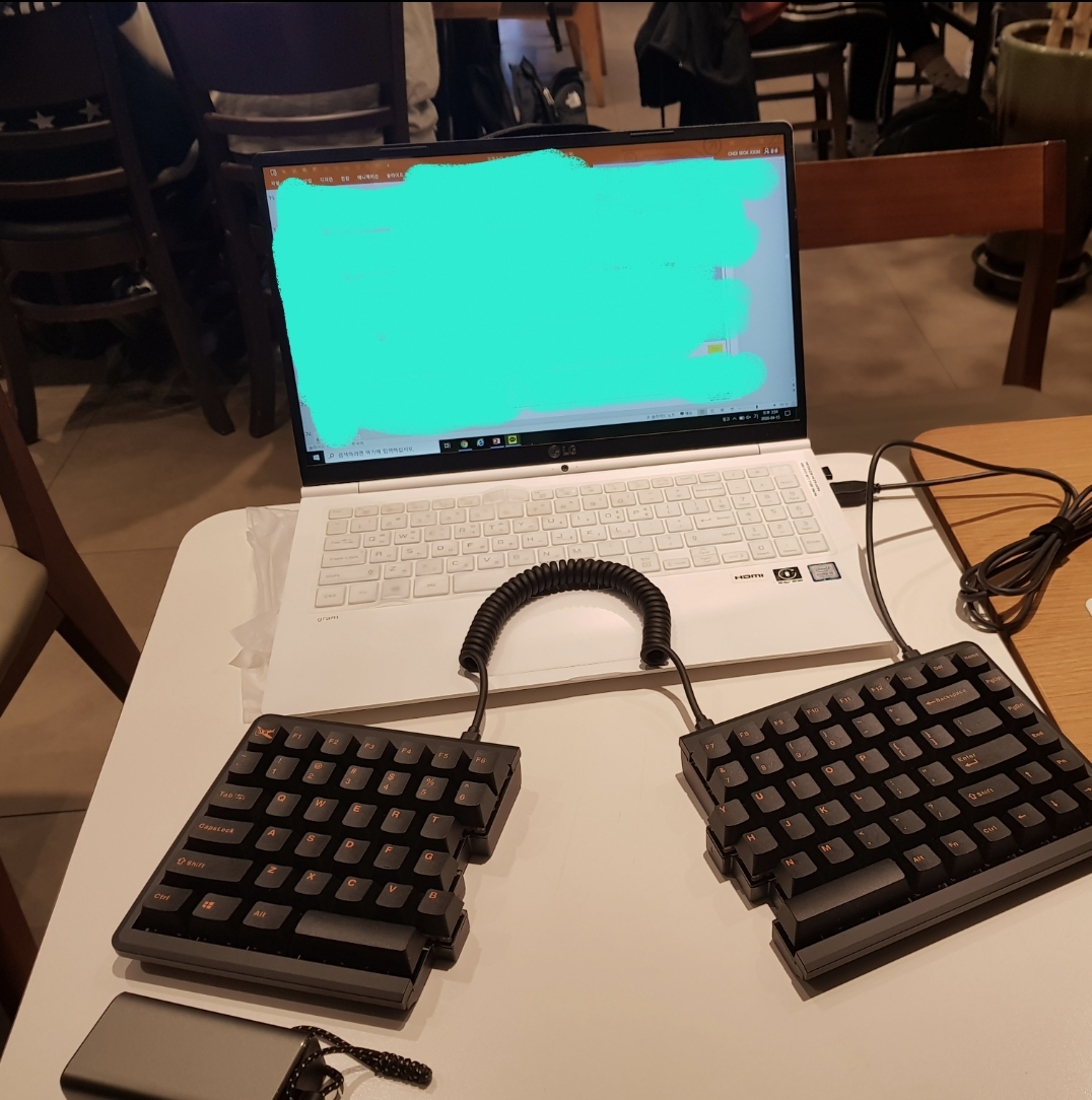 키보드라는 특성상 조그만 판에 양손을 얹어서 쓰는 형태가 되는데 장시간 키보드를 치자보면 양 어깨가 손을 따라 안쪽으로 움추린 상태가 되곤 했습니다. 개인적으로 원래 라운드 숄더 경향이 있어서 더 신경 쓰였던 부분이었는데요, 분리된 키보드를 책상 양쪽으로 크게 배치해두면 자연스럽게 어깨가 펴지는 효과를 얻을 수 있습니다. 다만 동봉되어 있는 케이블이 ㄱ자형이 아닌 I자형이라 키보드를 양쪽으로 크게 배치하기 어려운데 이는 케이블만 바꾸면 얼마든지 양손 넓게 사용이 가능합니다.
