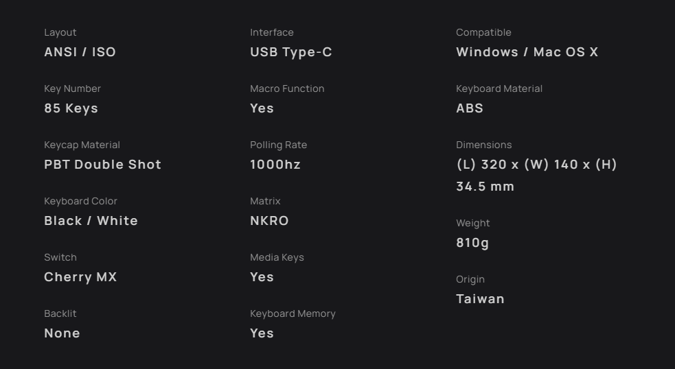 미스텔 키보드의 스펙입니다. 표준사이즈의 75% 크기로 되어있으며 기본적으로 USB C 타입으로 연결됩니다. 키캡은 PBT 재질인데 잘은 모르지만 좋은 재질이라고 합니다. 스위치는 Cherry MX를 사용하는데 많이들 사용하는 스위치니 개인의 취향에 따라 결정하시면 됩니다.