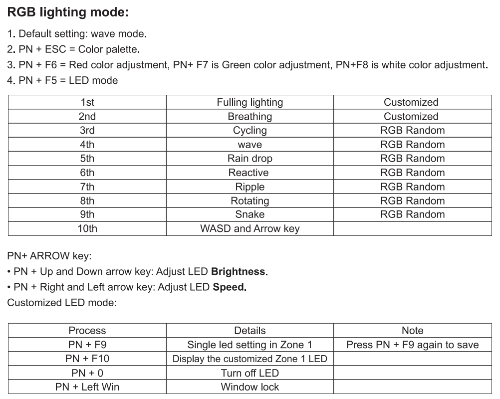 PN+F5를 누르면 위에 나온 모드 순서대로 RGB가 바뀌게 됩니다. 이 중 1st, 2nd의 경우 RGB가 랜덤이 아니라 커스텀인데요 이 말은 제가 원하는 색으로 바꿀 수 있다는 것예요. PN+ESC를 누르면 키보드가 순간 키별로 각기 다른 색을 보여주는데 이때 원하는 색의 키를 눌러주면 그 색으로 바뀌게 됩니다.