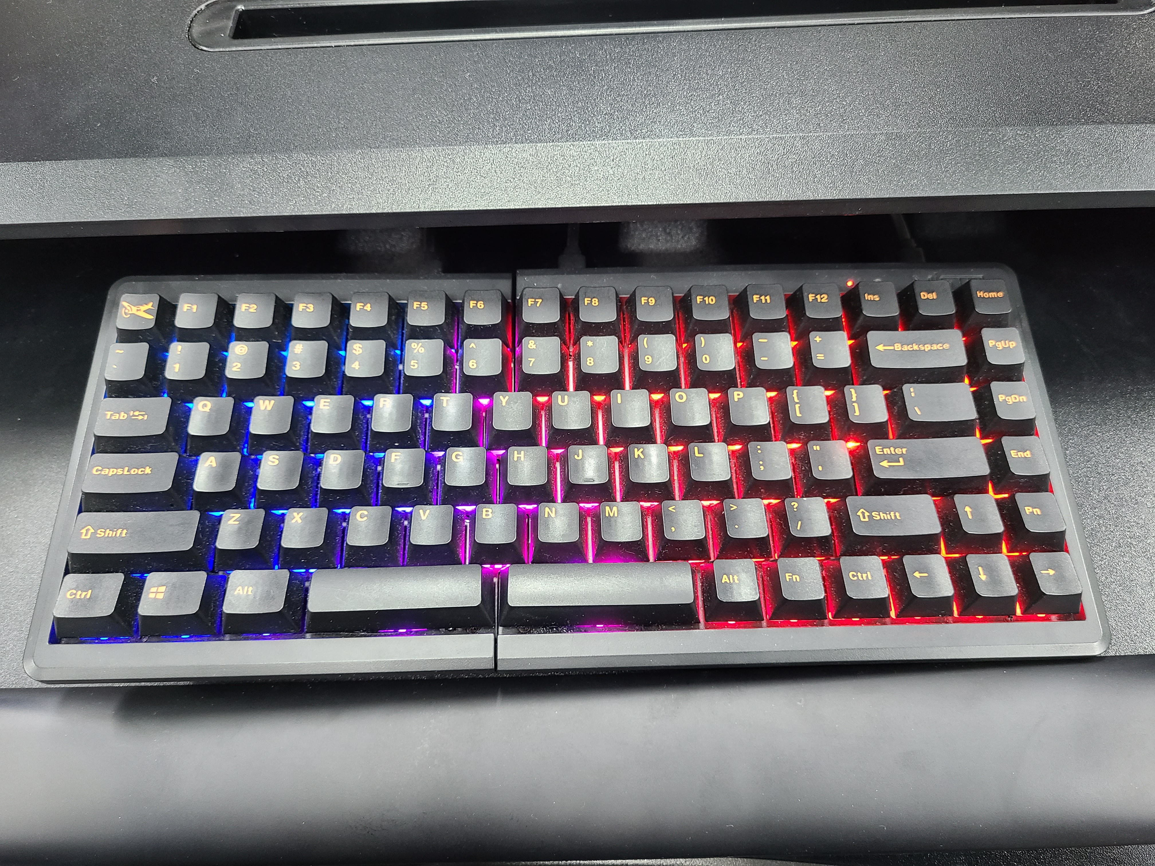 우선 사무용품을 개인 돈을 써서 구매하는 분들이 그리 많지 않은데 RGB가 들어오는 키보드에다가 반으로 똑 나눠진 키보드를 보면 주변에서 엄청 신기해하십니다. 여기서 매크로 기능 좀 보여드리면 게임 끝.