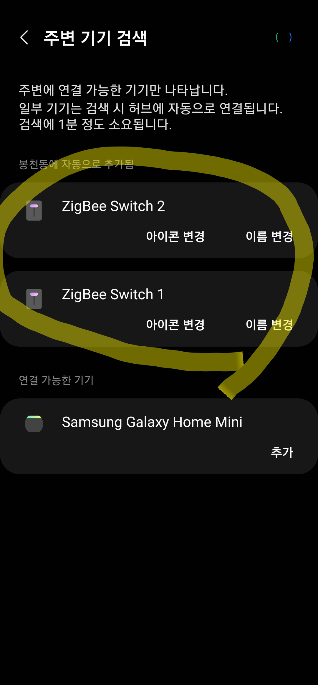 - 그러면 기기 추가에 zigbee switch1,2 가 뜨면서 자동으로 추가됩니다.