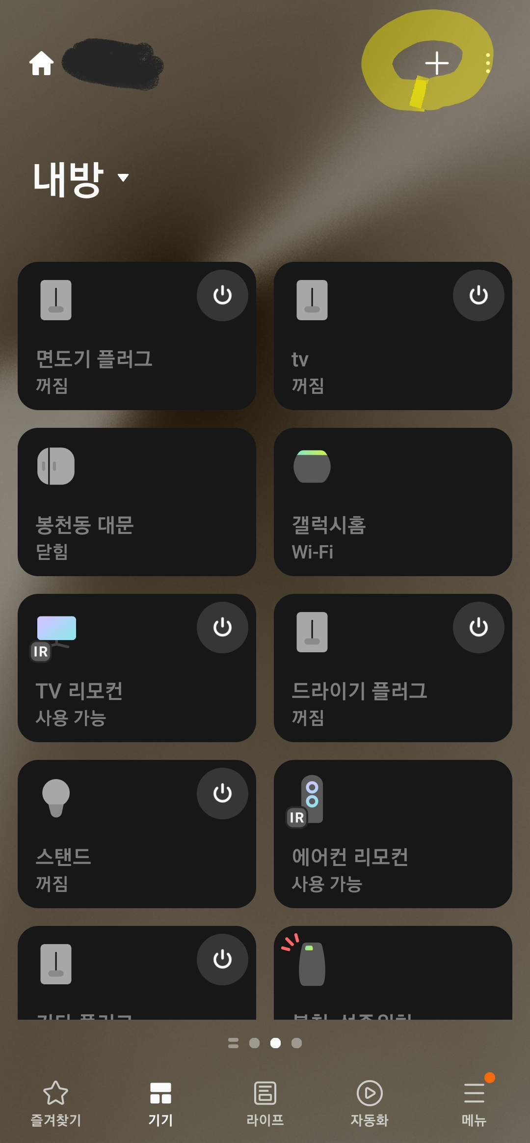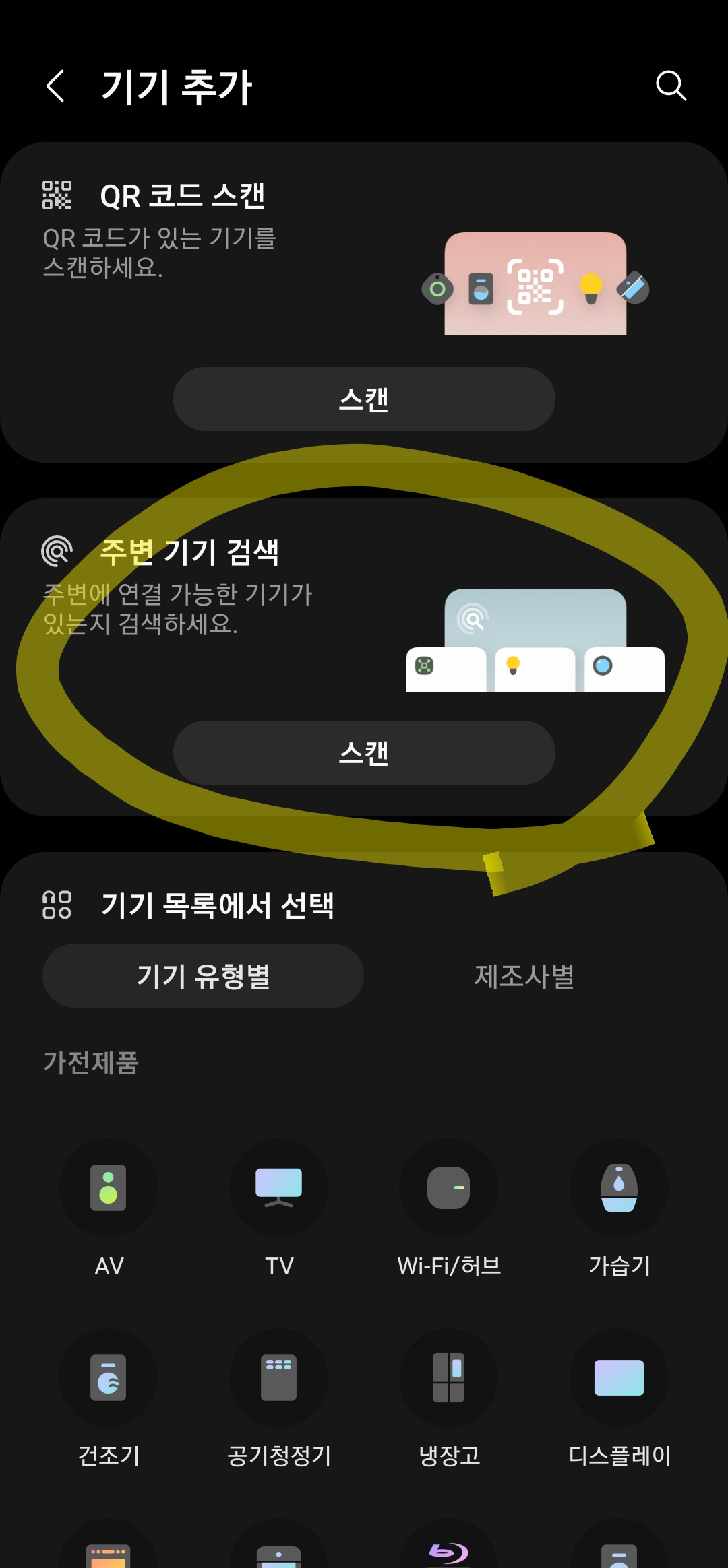- 스마트싱스 어플에서 우측 상단에 '+' 버튼을 누르고 기기 추가로 주변 기기 검색을 합니다.