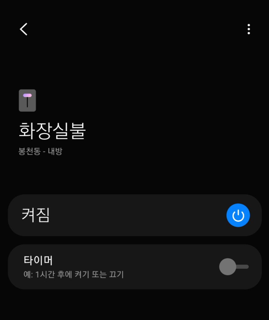 이렇게 추가하고 이름까지 변경하면 스마트싱스에서 원격 제어 혹은 음성명령이 가능해집니다. 아주 쉬워요! 저 같은 경우 장치 이름을 상당히 구어체스럽게 만듭니다. 화장실 조명보다는 화장실 불이 훨씬 더 입에 감기죠. 그래야 음성 명령할 때 자연스럽게 작동이 되는 거 같아요!