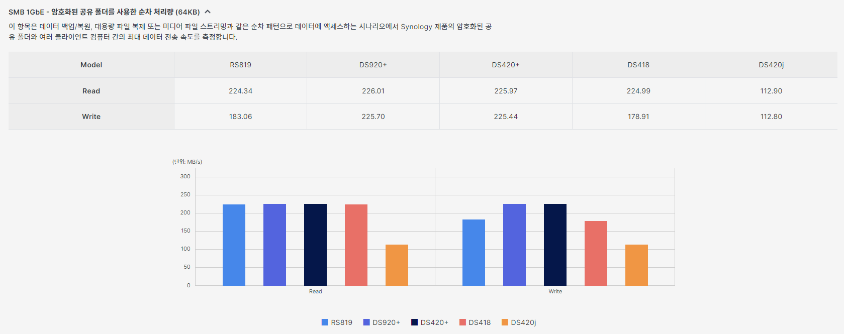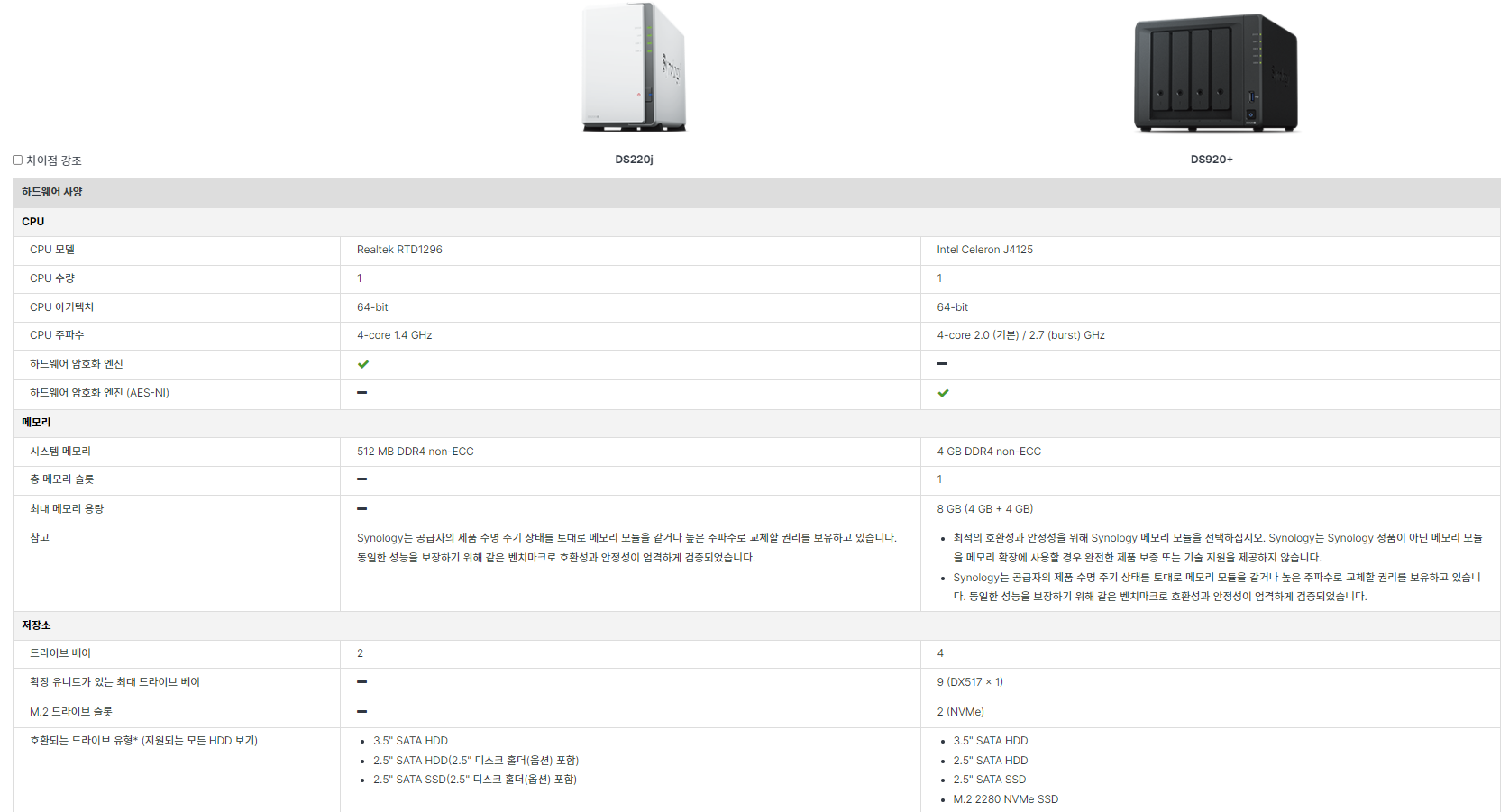 시놀로지 공홈에 가서 성능 비교를 해보려니 ds220J와 ds920+ 직접적인 비교가 불가합니다. 두 개의 베이 숫자가 달라서 비교가 불가해요. 그래서 같은 J 시리즈인 ds420J와 ds920+를 비교해봅니다.
