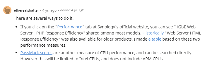 스마트폰, 닌텐도 등 소형 전자기기에 들어가는 CPU인 듯합니다. 그리고 외국 친구가 말하는 내용에서 시놀로지 공홈에서 성능확인이 가능하다고 하여 다시 확인해봅니다.