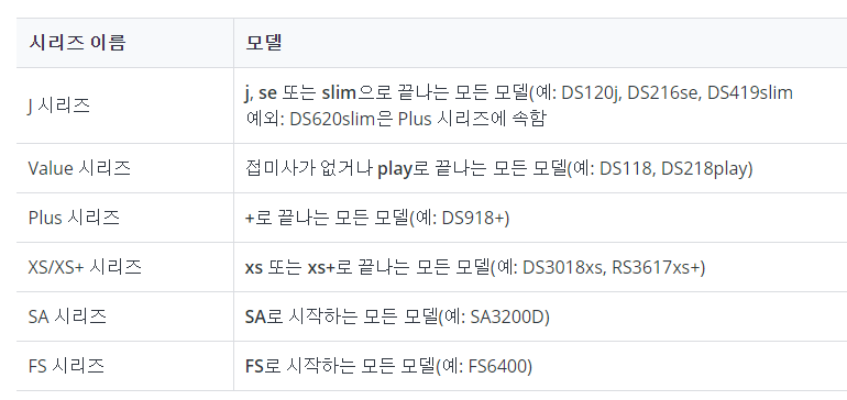 특히 여기서 시리즈 종류라고는 되어있지만 실제로는 play라던가 아무것도 안 적혀있는 나스도 있거든요. 이런 건 모두 밸류 시리즈에 속한다고 보시면 됩니다. 자세한 분류는 시놀로지 홈페이지에 나온 내용 참고해주세요!