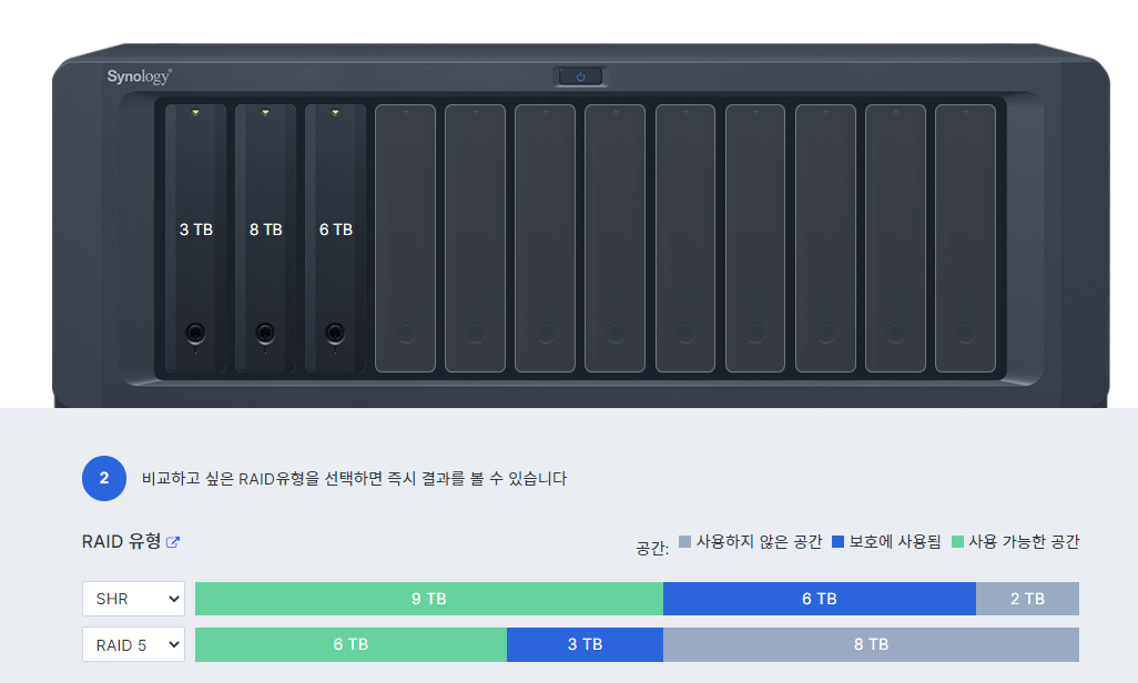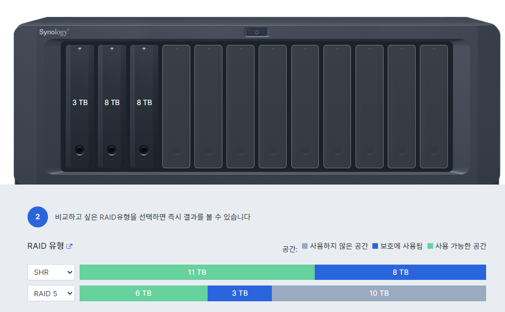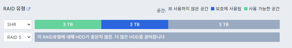 레이드에 대한 지식이 없었던 과거엔 3 테라 + 8 테라 조합을 RAID 1과 RAID 0으로 사용할 수 있을 줄 알았습니다. 아주 대단한 큰 착각이었죠. 그 착각의 대가로 3년간 나머지 5 테라를 사용하지 못한 채 사용했습니다. 그러던 중 최근에서야 시놀로지에서 레이드 계산해준다는 것을 알게 됐어요. (매우 뒷북)